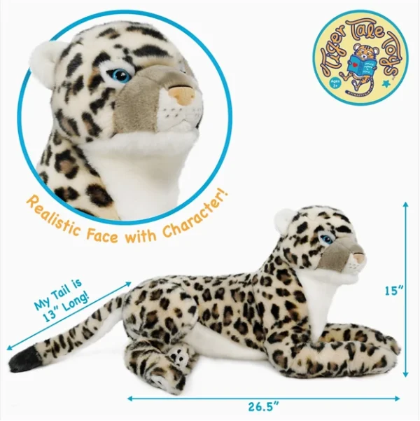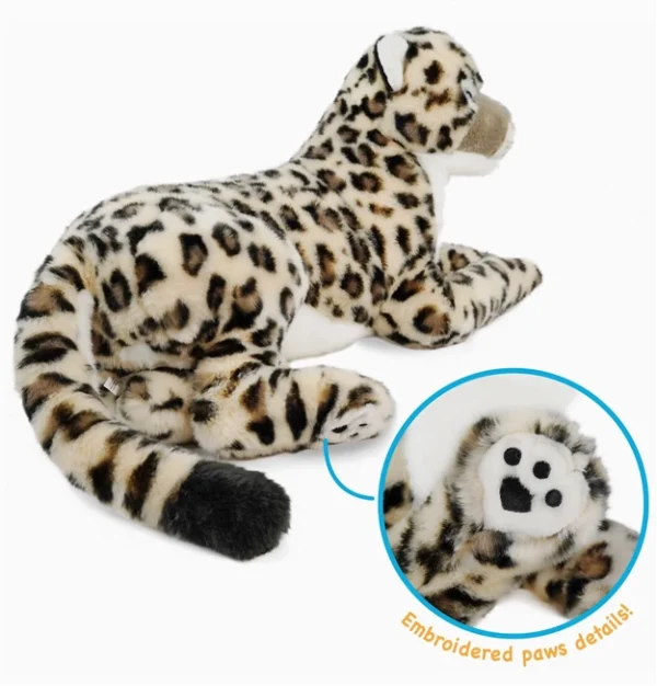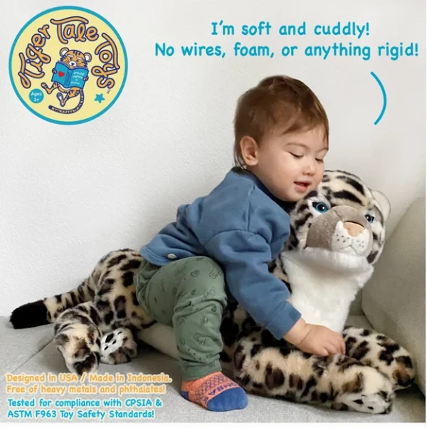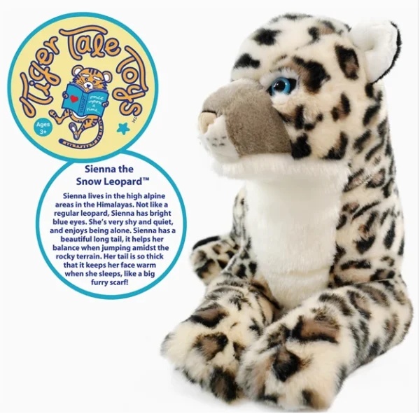 Sienna lives in the high alpine areas in the Himalayas. Not like a regular leopard, Sienna has bright blue eyes. She’s very shy and quiet, and enjoys being alone. Sienna has a beautiful long tail, it helps her balance when jumping amidst the rocky terrain. Her tail is so thick that it keeps her face warm when she sleeps, like a big furry scarf! – Size: 30 x 12 x 14 in inches | Weighs approximately 1.98 in pounds – Soft plush fabric | Super cute | Comes with its own story – No phthalates, lead, BPA, or heavy metals | Tested in accredited labs for compliance with CPSIA and ASTM F963-11 safety standards.
